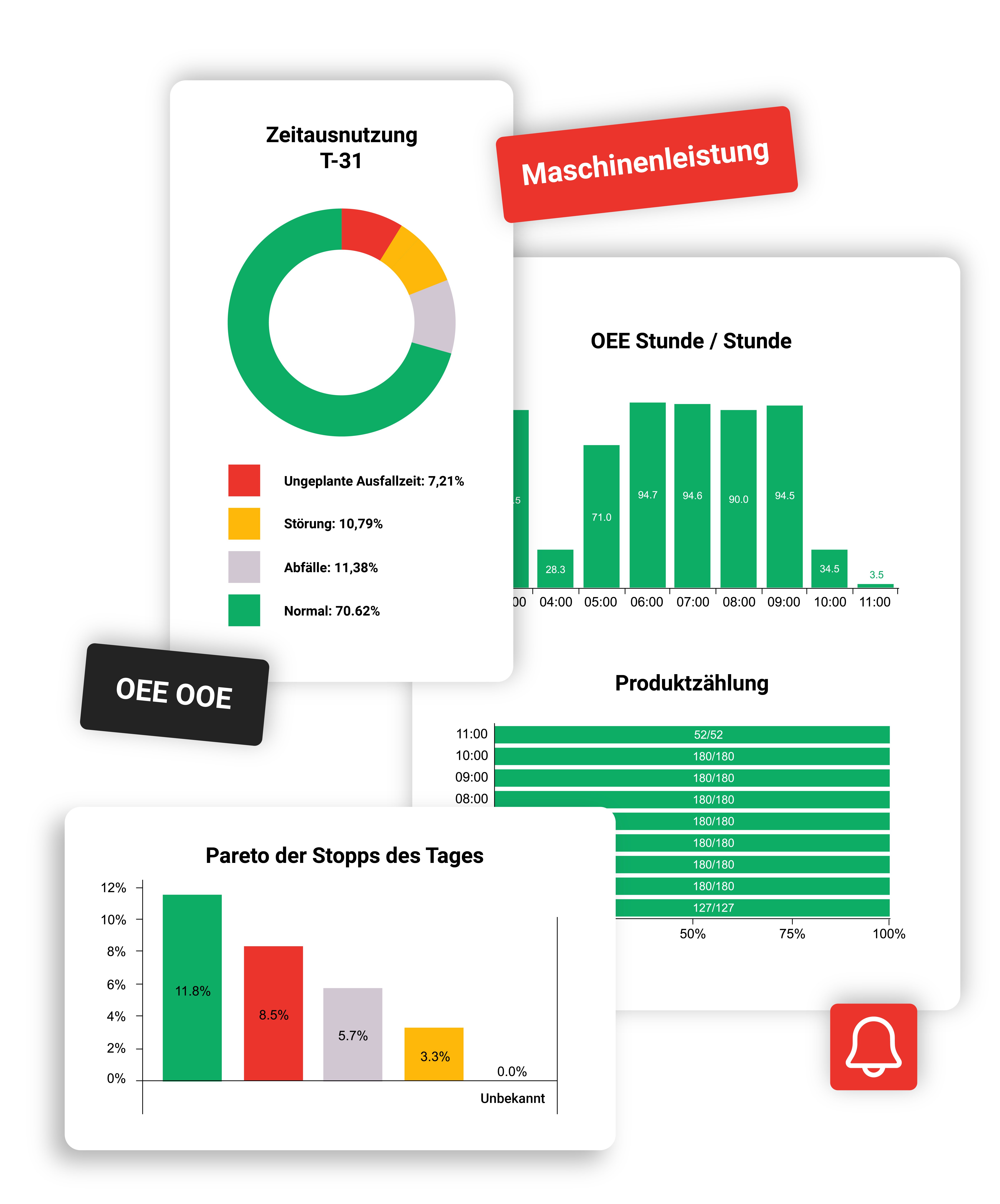Greife auf eine ganze Reihe von Analysewerkzeugen zu, darunter Leistungsindikatoren, Echtzeitalarme, Verlaufsdaten, Pareto-Analysen von Stillständen, automatische Zählberichte und die Anzeige von Ausschussquoten. Diese Funktionen helfen dir dabei, deine Produktionsprozesse kontinuierlich zu überwachen, zu bewerten und zu optimieren.