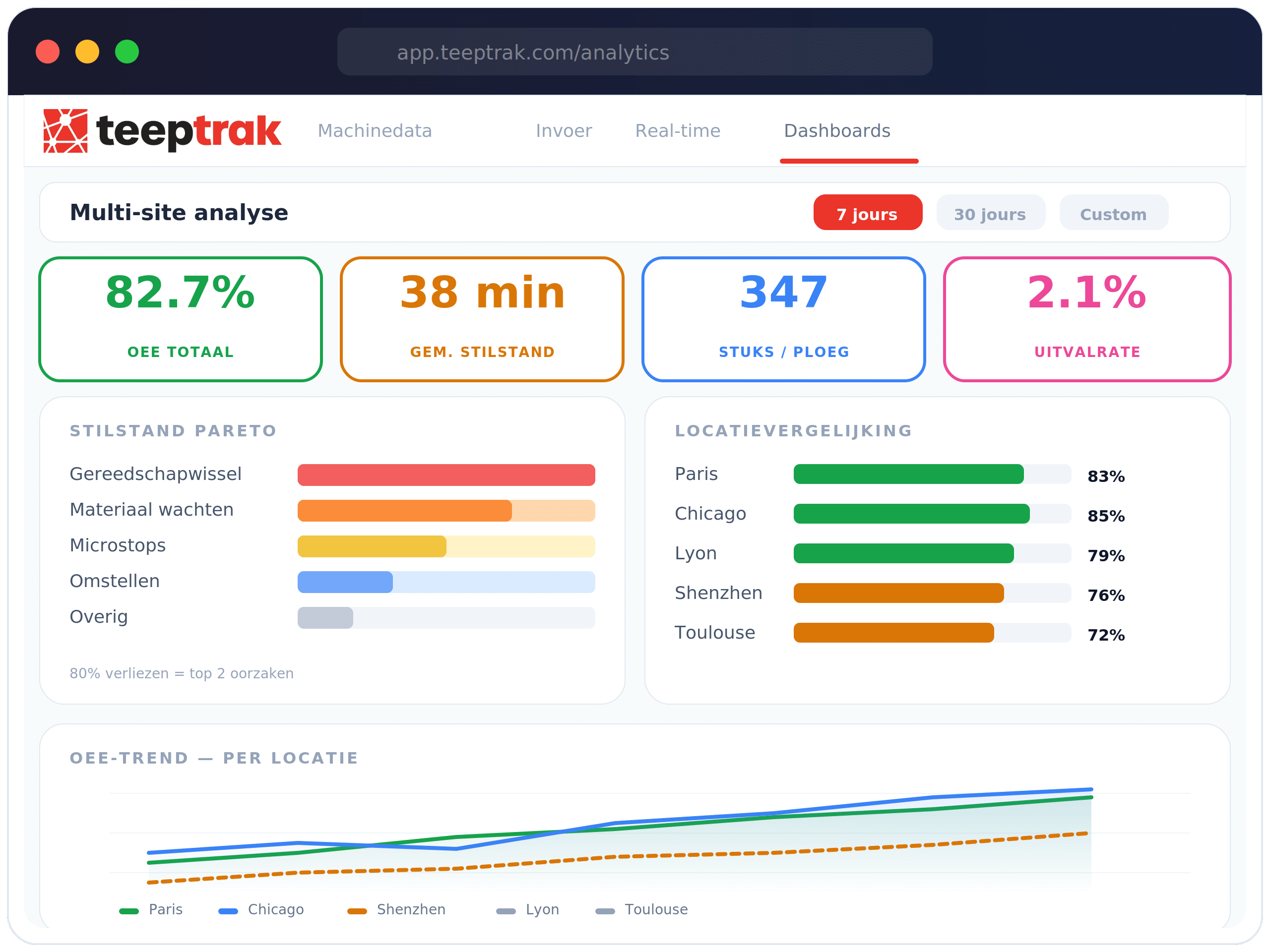 In tegenstelling tot een eenvoudige “OEE-teller” combineert TEEPTRAK machinegegevens + operatorinput om de context voor verliezen te bieden (oorzaken van stilstand, uitval, snelheden, procesafwijkingen).