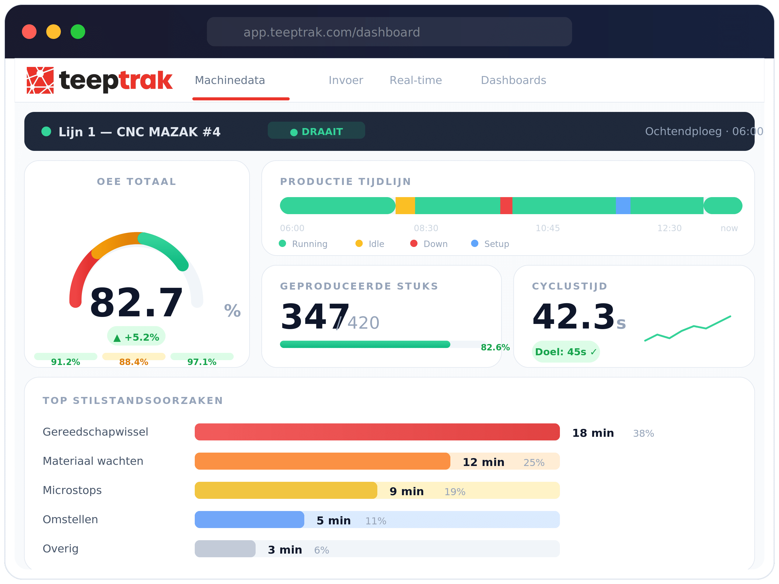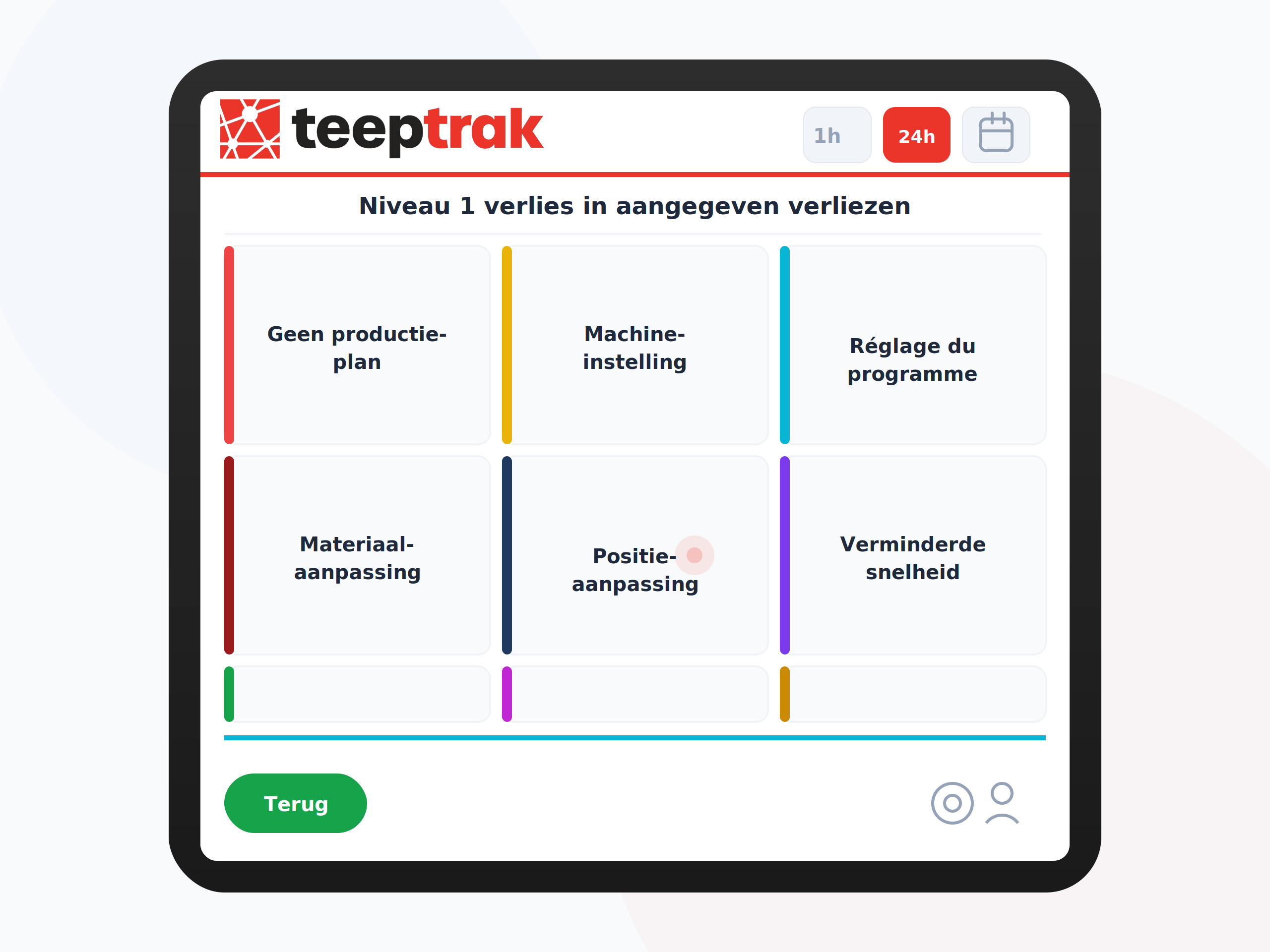 In tegenstelling tot een eenvoudige “OEE-teller” combineert TEEPTRAK machinegegevens + operatorinput om de context voor verliezen te bieden (oorzaken van stilstand, uitval, snelheden, procesafwijkingen).