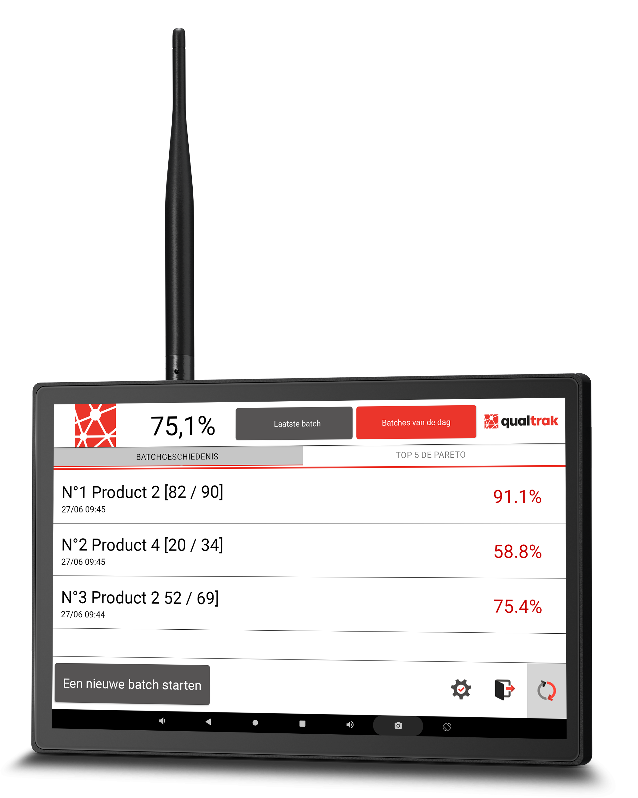 De tablet-interface van QualTrak is speciaal ontworpen om een duidelijk en onmiddellijk beeld te geven van de kwaliteitsparameters tijdens je productieproces. Door essentiële gegevens te centraliseren in een intuïtieve applicatie, kun je de prestaties van je apparatuur nauwkeurig en in realtime volgen.